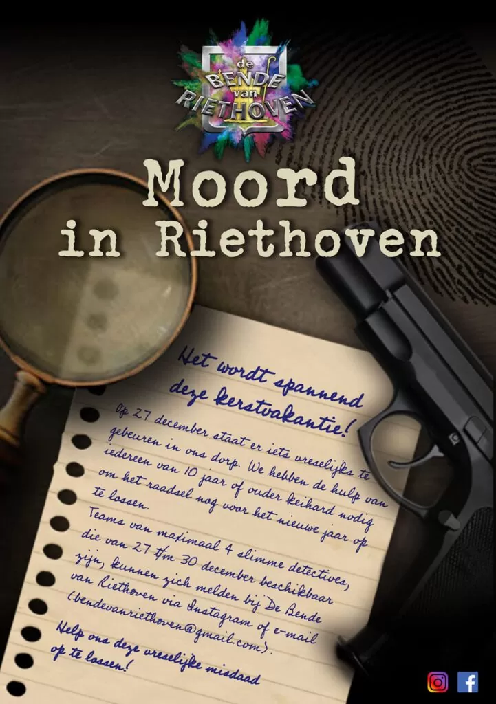 Het gaat een spannende kerstvakantie worden Twee jaar nadat we in ons dorp een vreselijke moord hebben moeten verwerken dreigt het dit jaar toch weer fout te gaan. Daarom vragen we iedereen om de komende tijd extra allert te zijn. Het moordspel van De Bende van Riethoven was in 2020 een groot succes. Daarom hebben […]